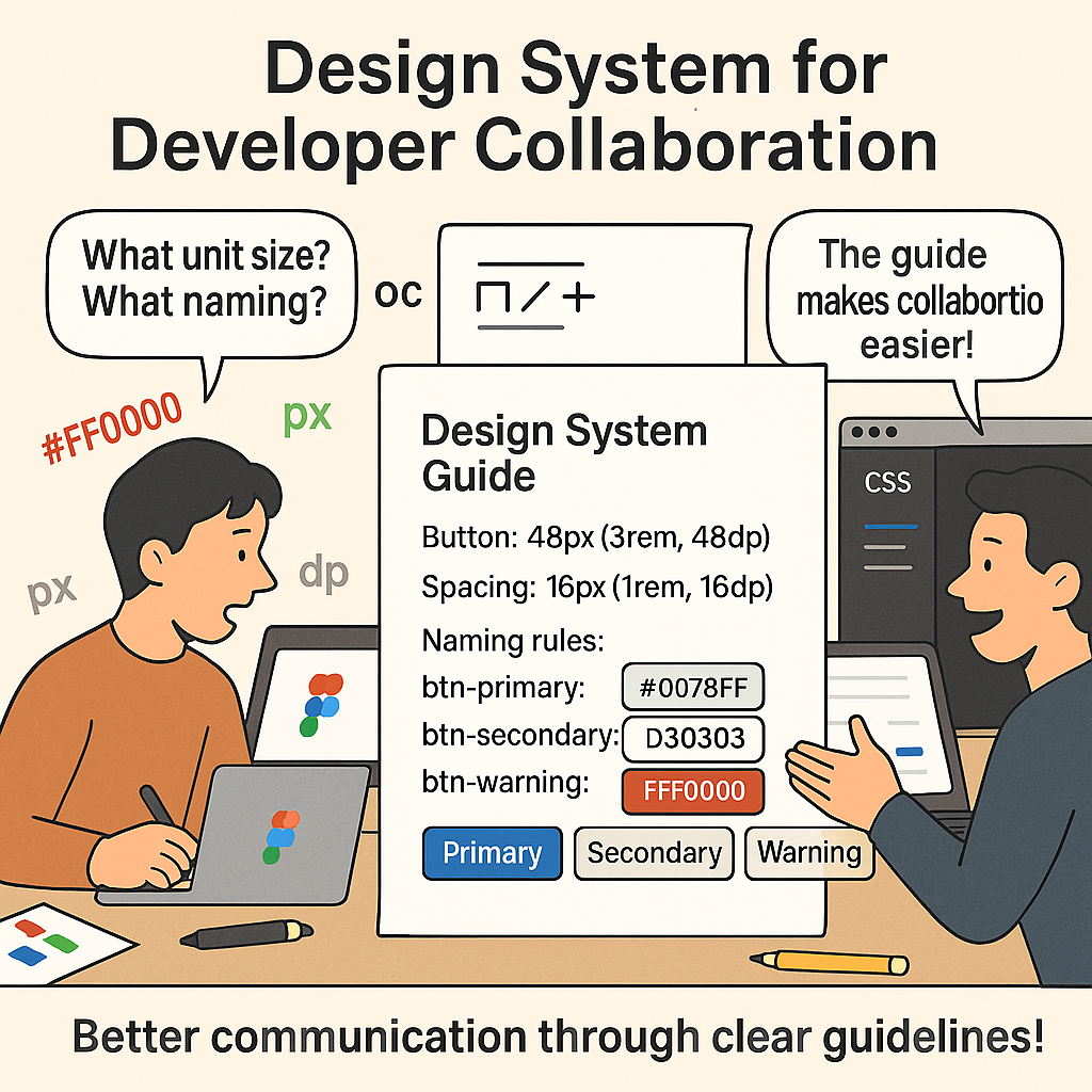 이 가이드를 개발자에게 공유하고, Figma의 "Inspect" 탭에서 값을 바로 확인할 수 있도록 안내했어요. 개발자가 "이 버튼의 색상 코드는 뭐지?" 하고 물어볼 때, "가이드 아트보드에서 color-primary로 확인해줘!"라고 하니까 바로 이해하더라고요. 또, 네이밍 규칙 덕분에 개발자가 CSS 클래스 이름을 btn-primary로 바로 적용해서 코드 작업이 빨라졌어요. 이런 작은 변화가 협업 효율을 정말 많이 높여주더라고요.