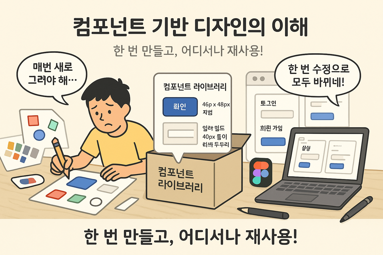 오늘은 디자인 시스템의 실무에서 정말 유용한 개념, 바로 컴포넌트 기반 디자인에 대해 이야기해보려고 해요. 저는 디자인 공부를 시작하면서 반복 작업에 지칠 때가 많았는데, 컴포넌트라는 개념을 알고 나니 작업이 훨씬 효율적이 됐어요. 여러분도 반복적인 디자인 작업에 지친 적 있지 않나요? 그럼 저와 함께 컴포넌트 기반 디자인의 세계로 들어가 볼까요?